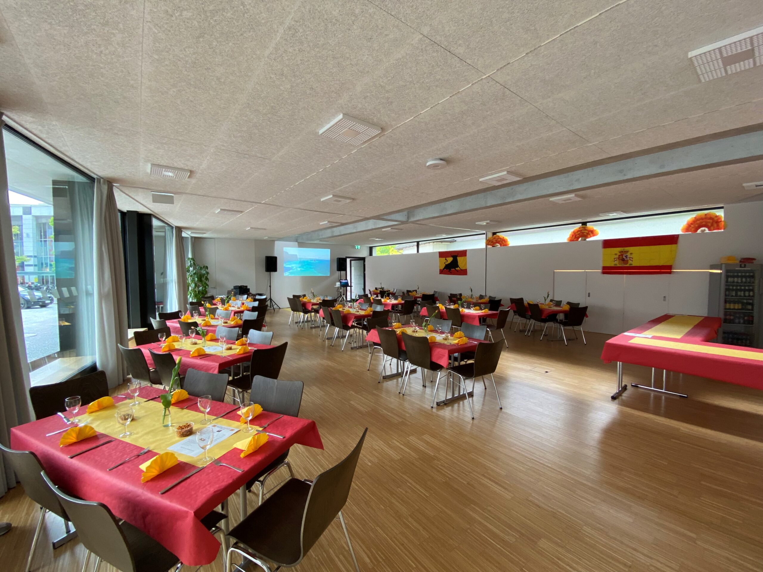 Die Bankettbestuhlung für maximal 84 Personen (14 Einzeltische à 6 Personen) respektive Konzertbestuhlung für 100 Besucher ist im Raum inklusive.